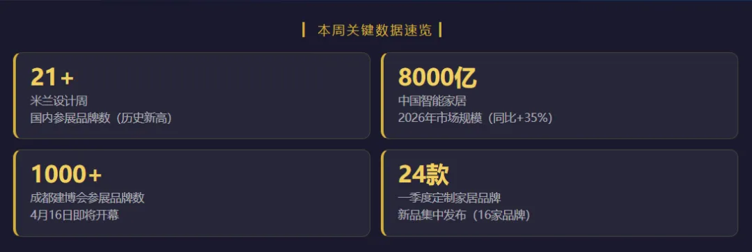 这一周,家居行业的"流量"都涌向了米兰——设计周主题"为人类而思考"引发全球共鸣,中国品牌史上最强阵容登场;国内这边,一季度新品季爆发,16家品牌推出24+款定制家居新作,从非遗贝母漆到AI量体裁衣,中国制造正在悄然完成一场"美学+科技"的双重跃迁。与此同时,AI家居市场规模突破8000亿,成都建博会蓄势待发……本期周报,和你一起复盘这个信息密度极高的一周。