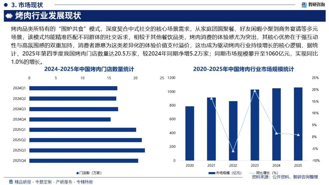 烤肉是以肉类为核心原料,通过明火炙烤、炭火熏烤、电烤炉加热、铁板煎烤等高温方式,使肉表形成焦香风味、内里保持鲜嫩口感的烹饪品类。烤肉品类所特有的“围炉共食”模式,深度契合中式社交的核心场景需求,从家庭团圆聚餐、好友闲暇小聚到商务宴请等多元场景,该模式均能精准匹配不同群体的社交诉求,相较于其他餐饮品类,烤肉消费的体验感尤为突出,其核心优势在于强互动性与高氛围感的双重加持,消费者愿意为这类差异化的体验价值支付溢价,这也成为驱动烤肉行业持续增长的核心逻辑,据统计,2025年第四季度我国烤肉门店数量达20.5万家,较2024年同期净增5.2万家;同期市场规模攀升至1060亿元,实现同比1.0%的增长。