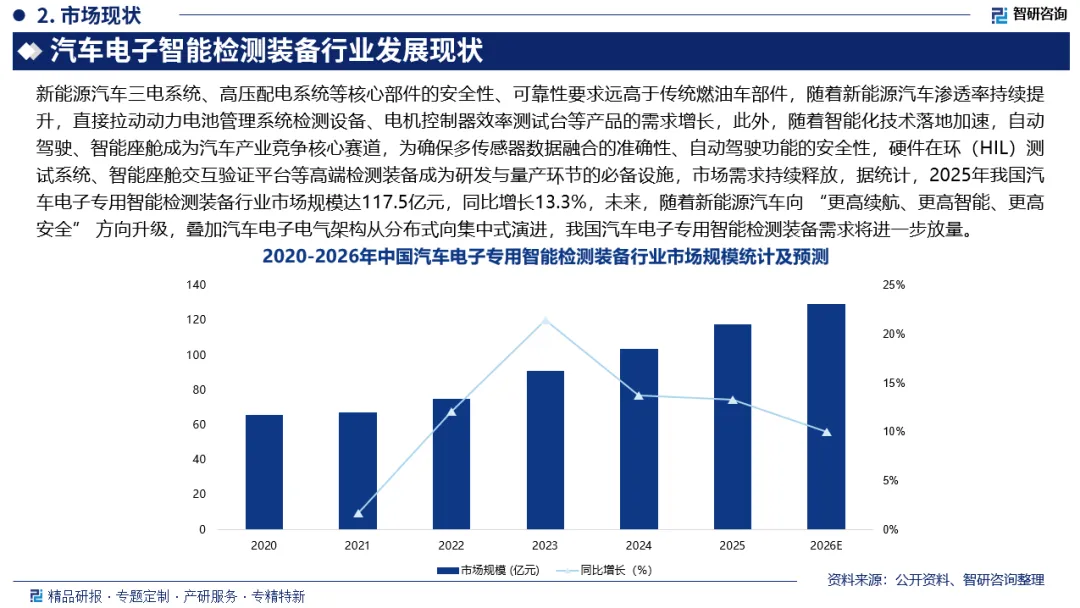 市场规模:新能源汽车三电系统、高压配电系统等核心部件的安全性、可靠性要求远高于传统燃油车部件,随着新能源汽车渗透率持续提升,直接拉动动力电池管理系统检测设备、电机控制器效率测试台等产品的需求增长,此外,随着智能化技术落地加速,自动驾驶、智能座舱成为汽车产业竞争核心赛道,为确保多传感器数据融合的准确性、自动驾驶功能的安全性,硬件在环(HIL)测试系统、智能座舱交互验证平台等高端检测装备成为研发与量产环节的必备设施,市场需求持续释放,据统计,2025年我国汽车电子专用智能检测装备行业市场规模达117.5亿元,同比增长13.3%,未来,随着新能源汽车向 “更高续航、更高智能、更高安全” 方向升级,叠加汽车电子电气架构从分布式向集中式演进,我国汽车电子专用智能检测装备需求将进一步放量。