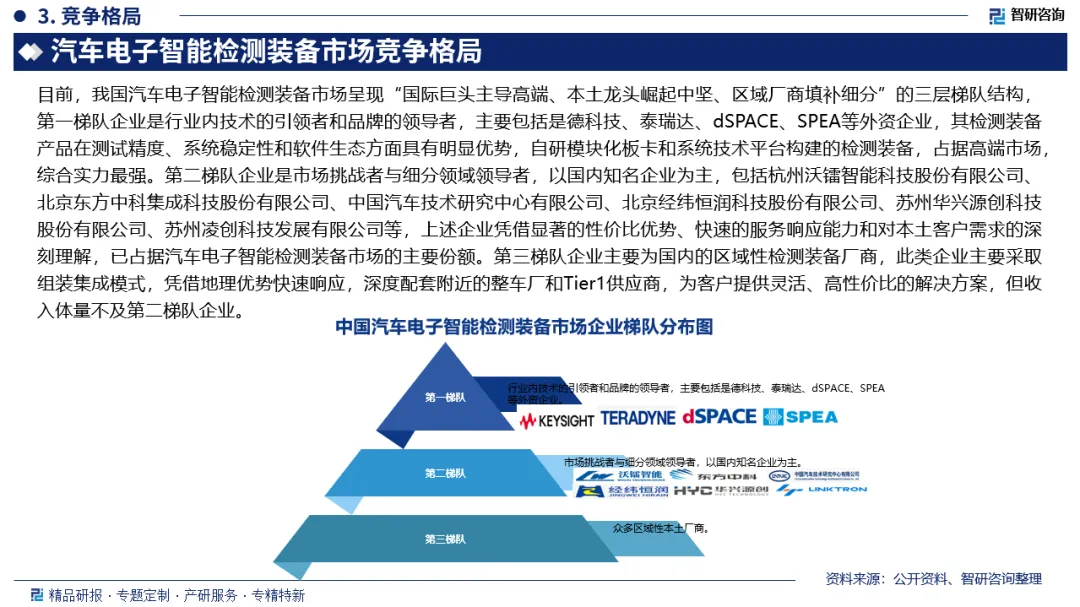 市场竞争格局:目前,我国汽车电子智能检测装备市场呈现“国际巨头主导高端、本土龙头崛起中坚、区域厂商填补细分”的三层梯队结构,第一梯队企业是行业内技术的引领者和品牌的领导者,主要包括是德科技、泰瑞达、dSPACE、SPEA等外资企业,其检测装备产品在测试精度、系统稳定性和软件生态方面具有明显优势,自研模块化板卡和系统技术平台构建的检测装备,占据高端市场,综合实力最强。