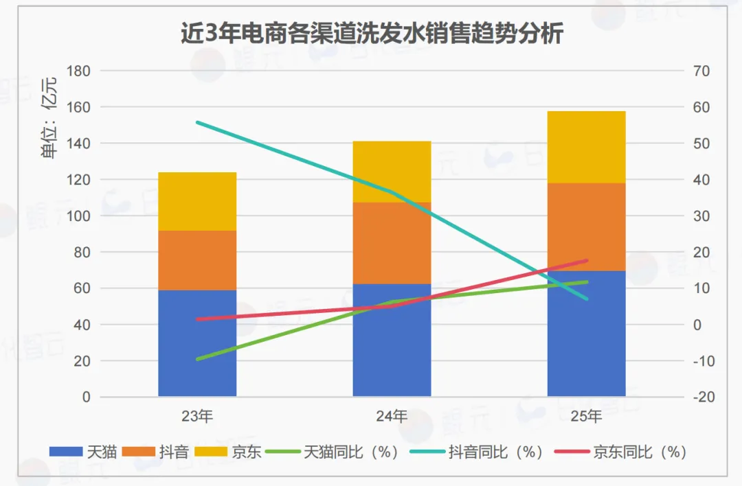2023年至2025年电商渠道洗发水销售额从123.79亿元增长至157.47亿元,累计增长约27.2%;销量从1.67亿件提升至2.21亿件,累计增长约32.5%,反映洗发水市场在电商渠道保持稳健扩容。
