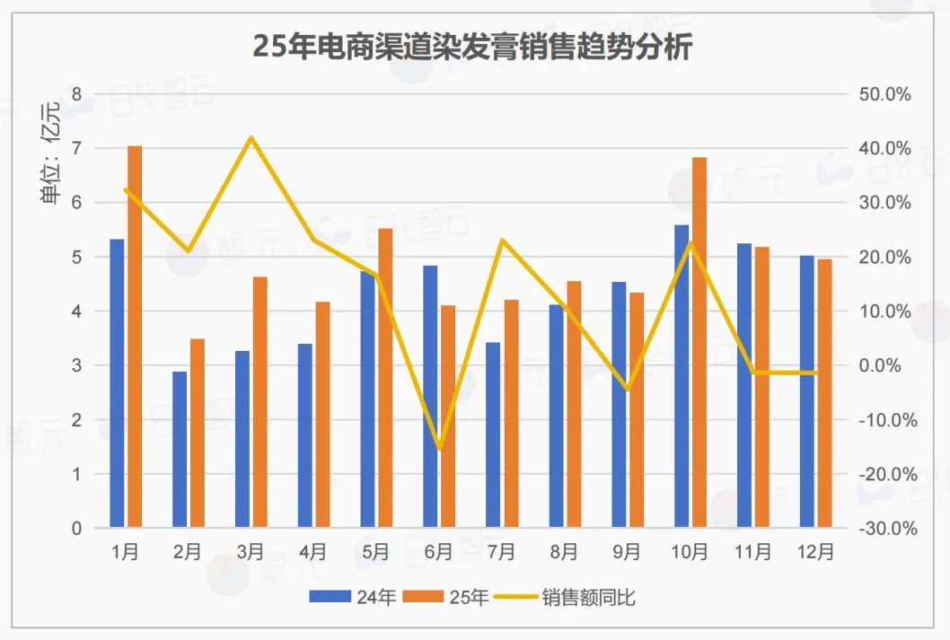 2025年1月(销售额同比增长32.3%)、3月(41.9%)、10月(22.5%)贡献全年主要增量,节日礼赠、换季换色、大促囤货驱动增长,证明染发膏已跻身美妆个护大促必囤品类。