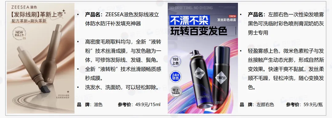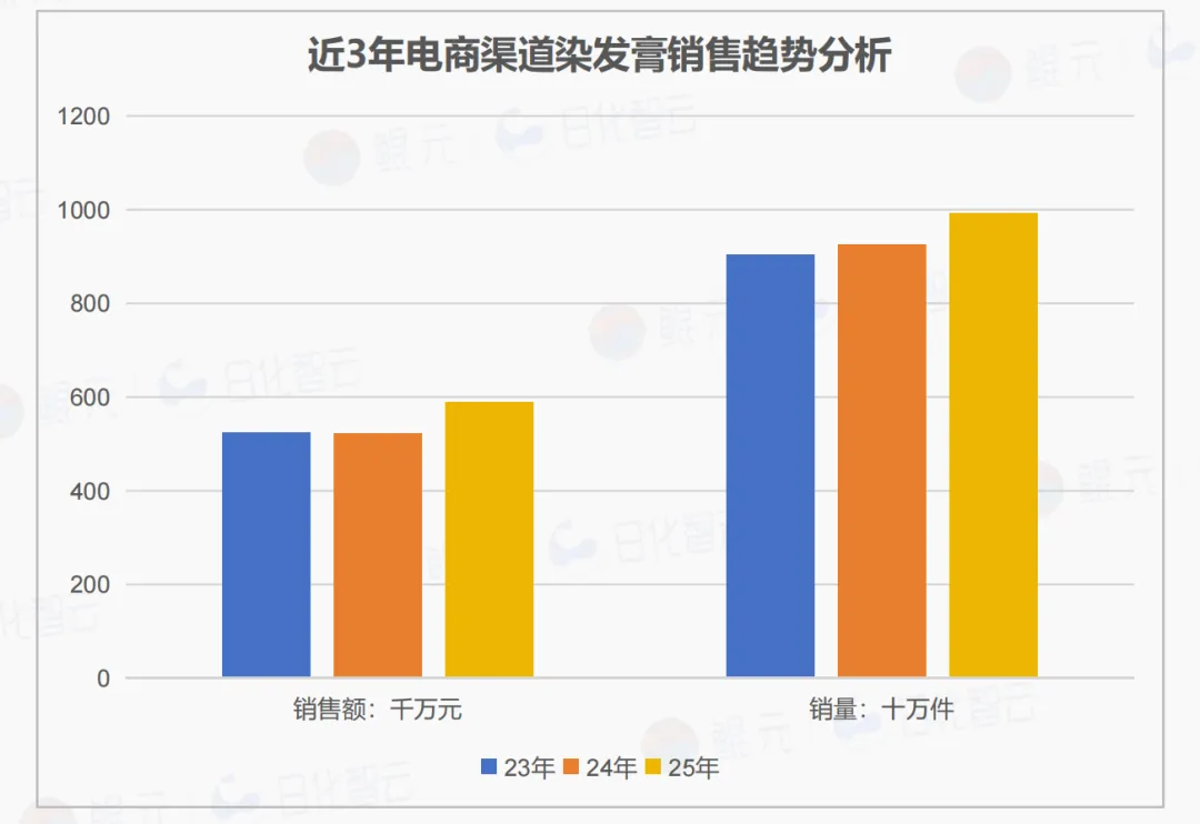 2024年电商渠道染发膏销售额与2023年几乎持平(同比微降0.2%)。2025年染发膏市场迎来强劲反弹,增速创近三年新高,销售额同比增速(12.7%)明显高于销量(7.2%),表明消费者愿意为更高客单价的染发产品买单。