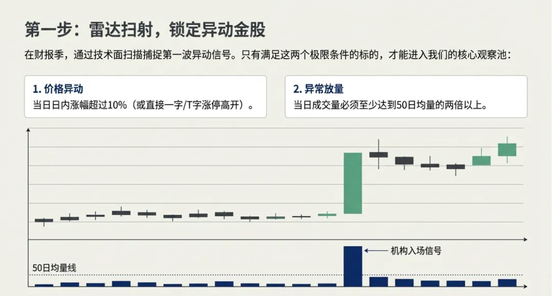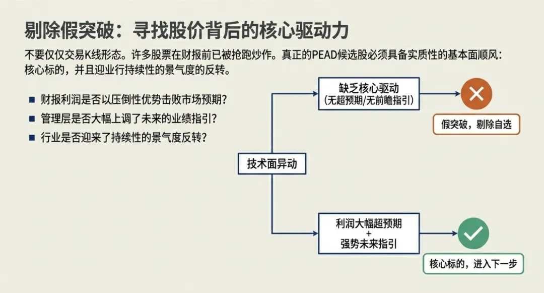 业绩支撑 | 盈余 beat > 75% 且指引上调。 | 盈余数据平平,仅靠题材驱动。 |