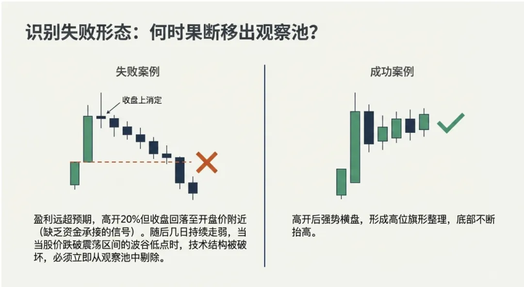 结构破坏 | 回撤不破启动日中轴,低点抬升。 | Case Study (Cipher Digital): 第三天即破波动低点,结构彻底失效。 |