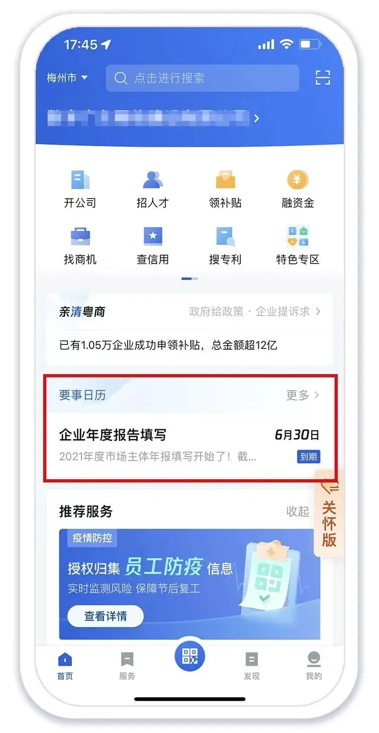 打开粤商通APP,将左上位置改为企业所在城市,点击“要事日历”中的【企业年度报告填写】。