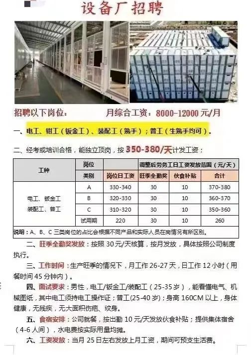 三江设备厂,招电工、钳工,装配工,8000-12000/月