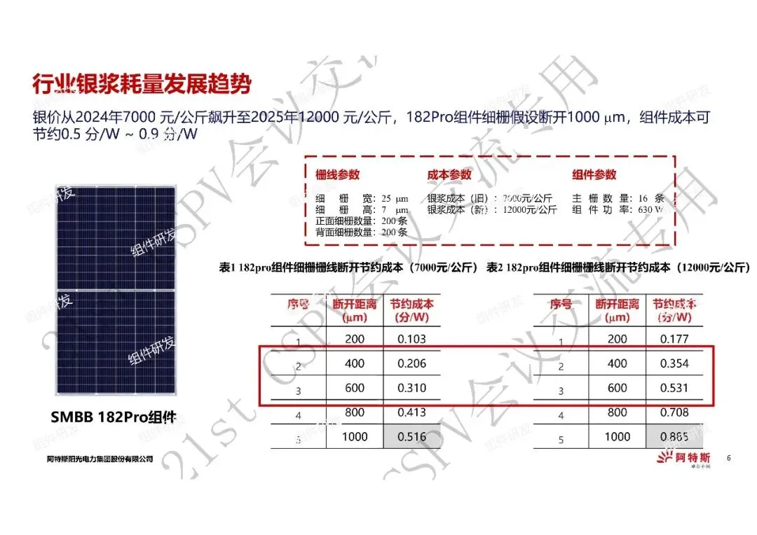 3、在电池效率降低0.01%以内、组件功率降低0.1%以内的情况下,错位式栅线断开,在仅背面栅线断开方式下,当断开距离在1000µm时,在所有断栅方式中节约成本最多,可达到0.504 /W。