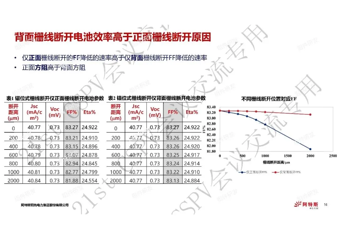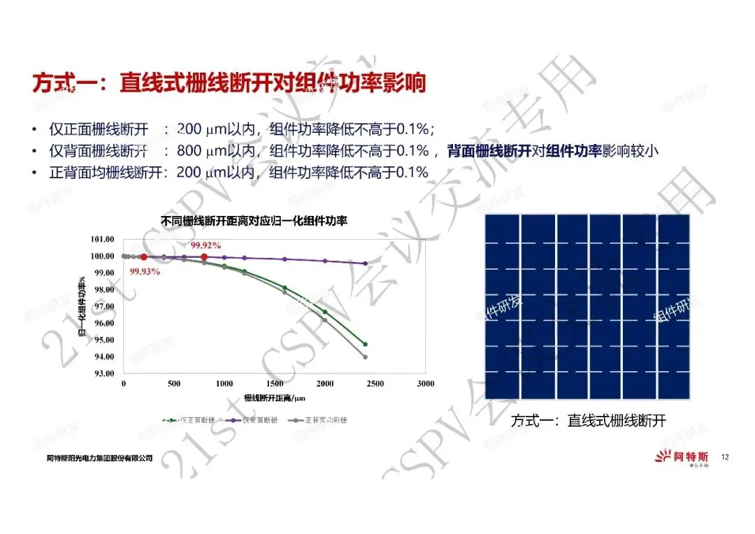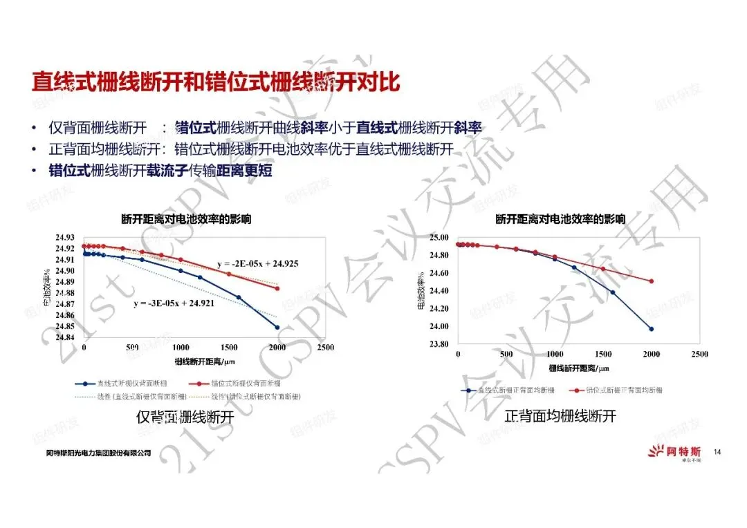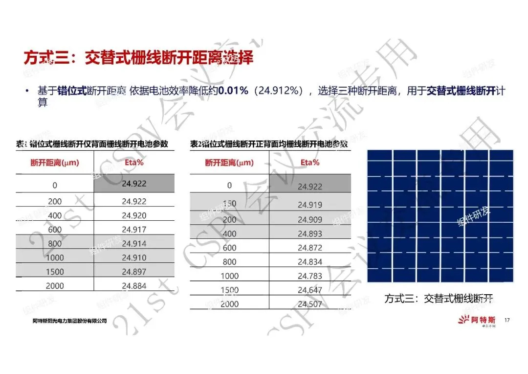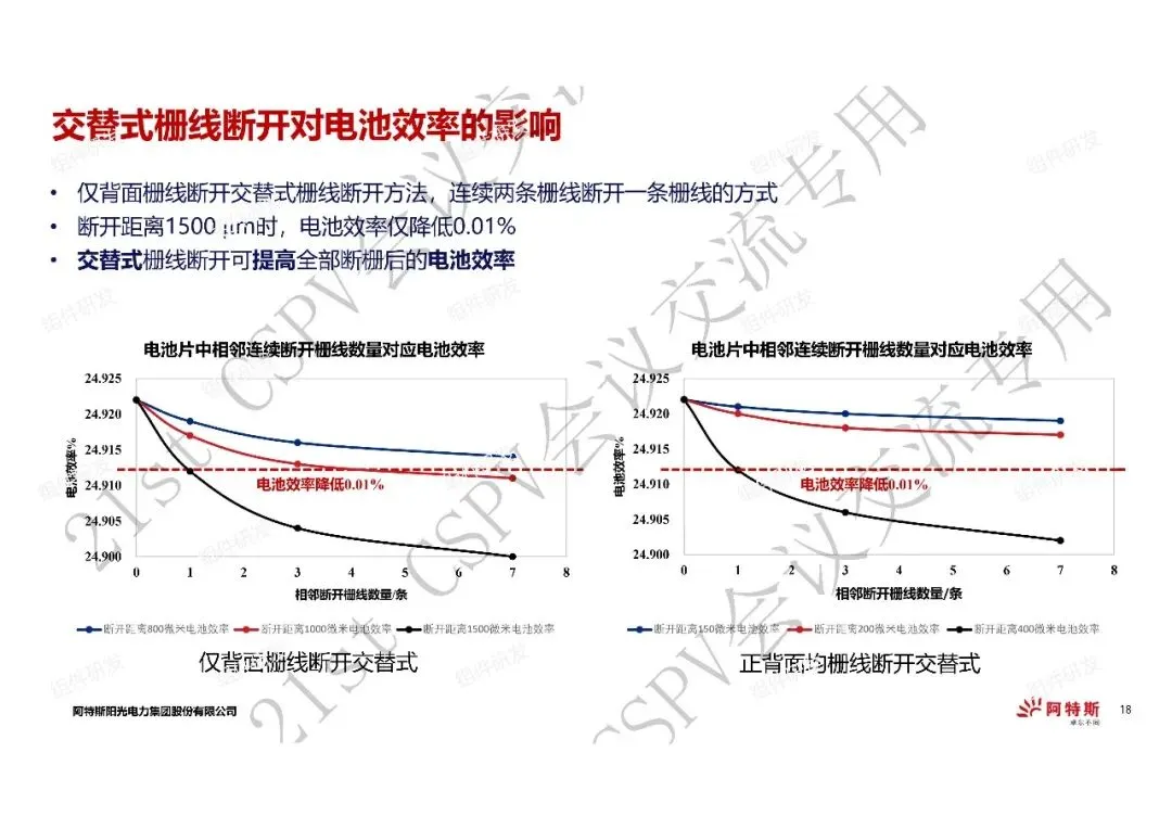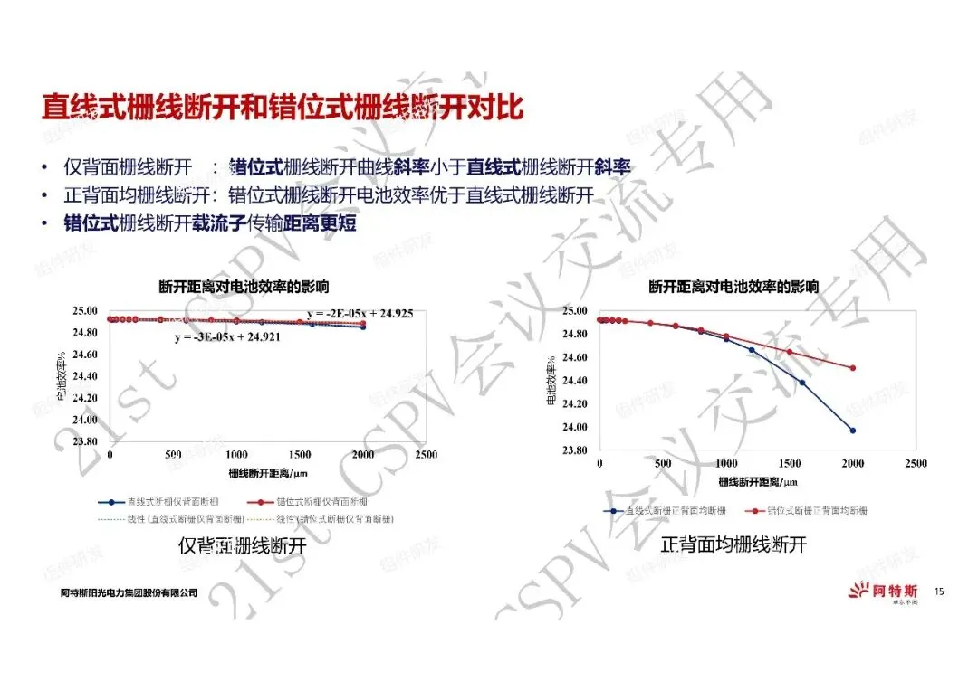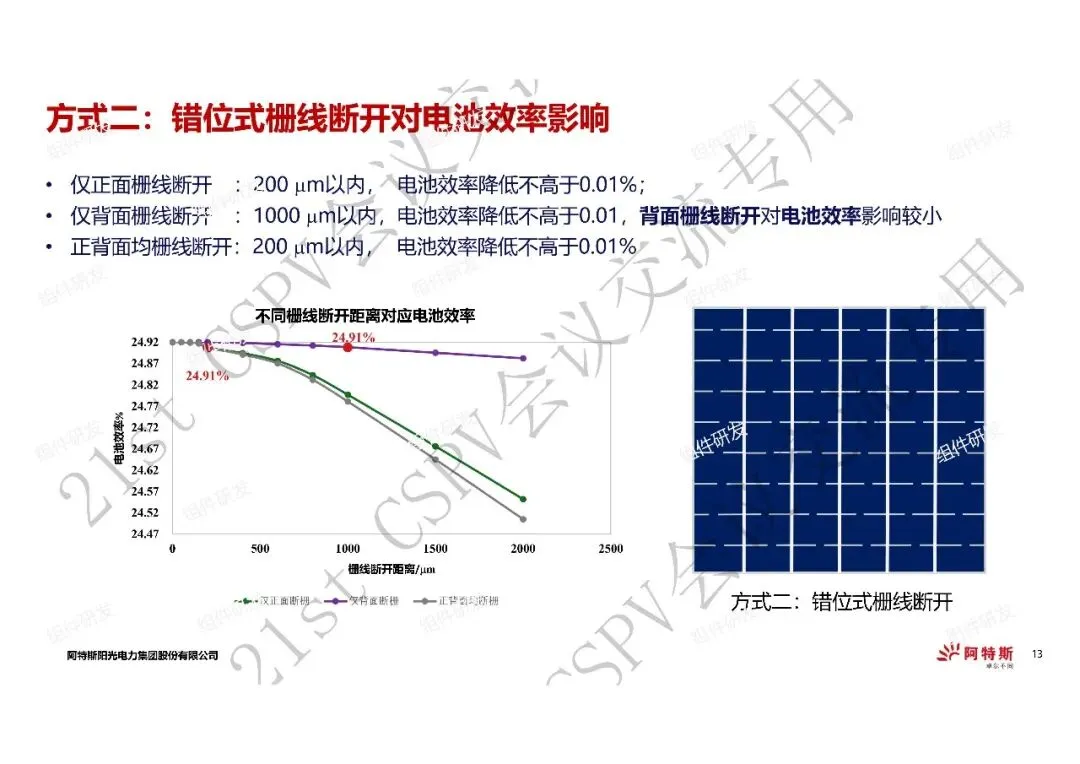 1、在电池效率降低0.01%以内的情况下,错位式栅线断开的断开距离优于直线式断栅断开距离,仅背面栅线断开方式最优;