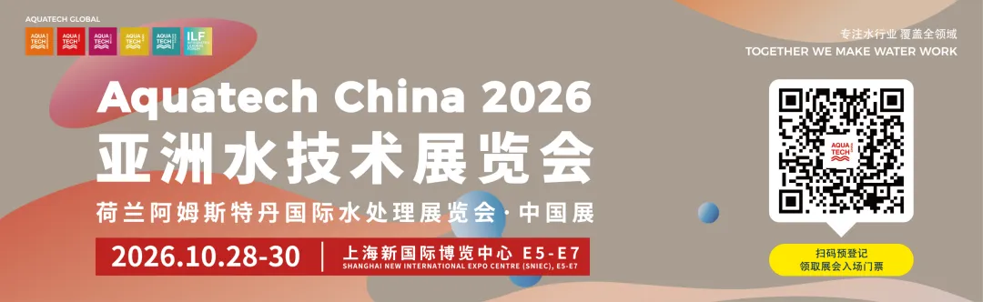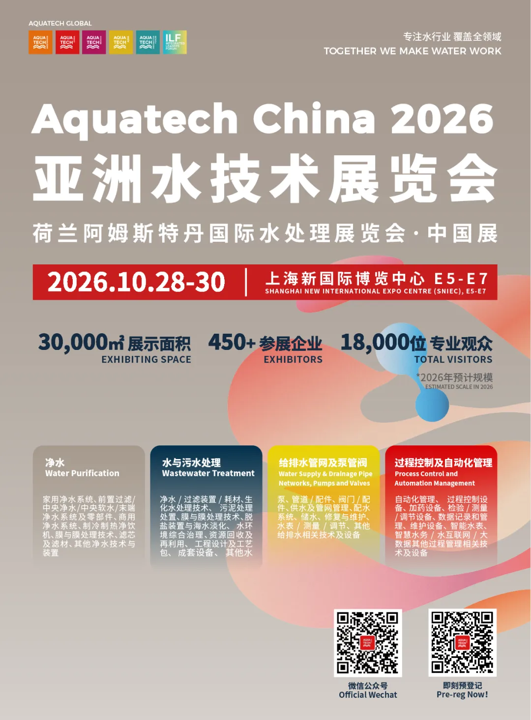 荷兰阿姆斯特丹国际水处理展览会·中国展暨Aquatech China 2026亚洲水技术展览会将于2026年10月28-30日在上海新国际博览中心盛大举办。作为专注于水、服务于水的水处理行业风向标展览会,Aquatech China展品覆盖水处理全产业链,包含净水、水与污水处理、水环境治理、给排水管网及泵管阀、过程控制与自动化管理、智慧水务等领域。展会背靠荷兰母展近60年水处理展会经验与资源,辐射亚太地区水处理行业,是全球水处理人技术交流、商贸往来的优选专业平台。Aquatech China由荷兰RAI锐昂展览集团大中华区子公司——锐昂展览(上海)有限公司主办。更多请访问官网: www.aquatechexpo.com