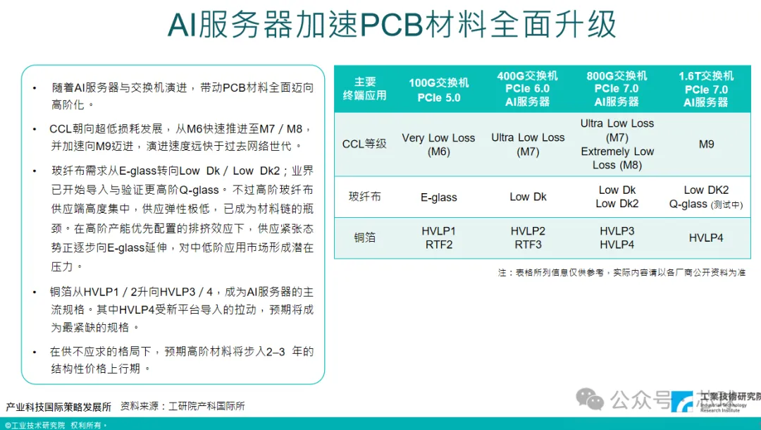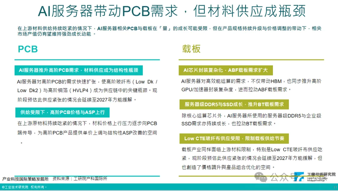 AI 服务器带动载板、高阶 PCB 需求暴涨,ABF 载板因 AI 芯片封装复杂度提升需求大增,BT 载板也受服务器级 DDR5/SSD 拉动。