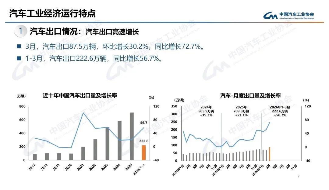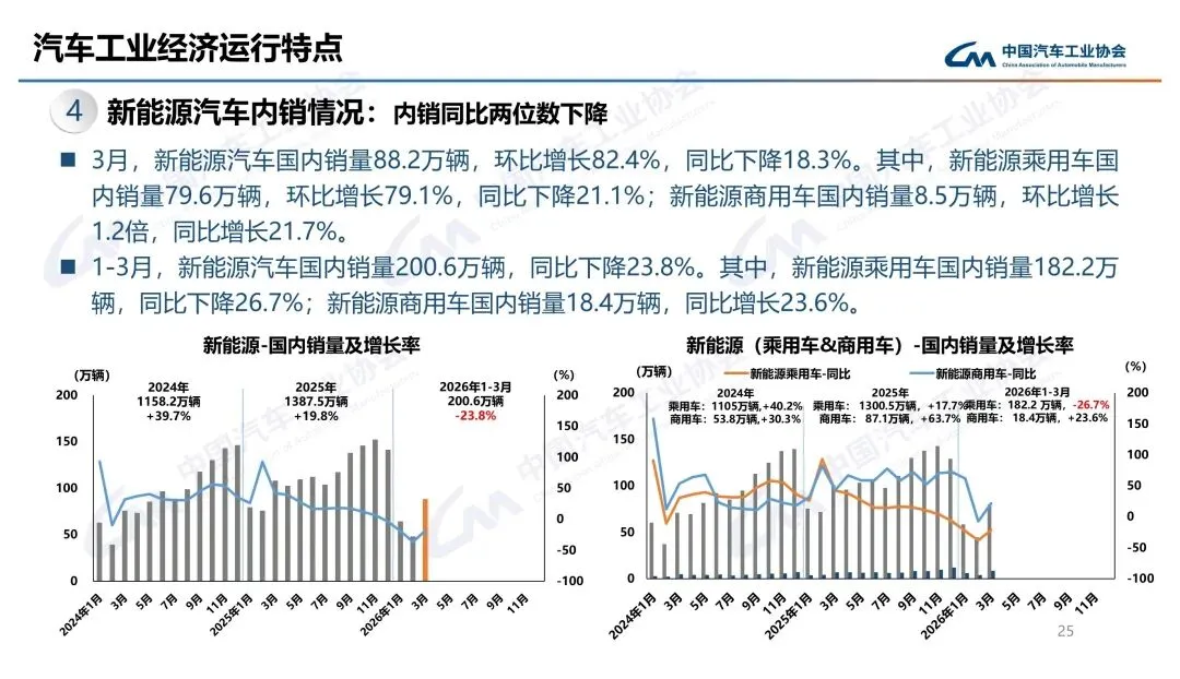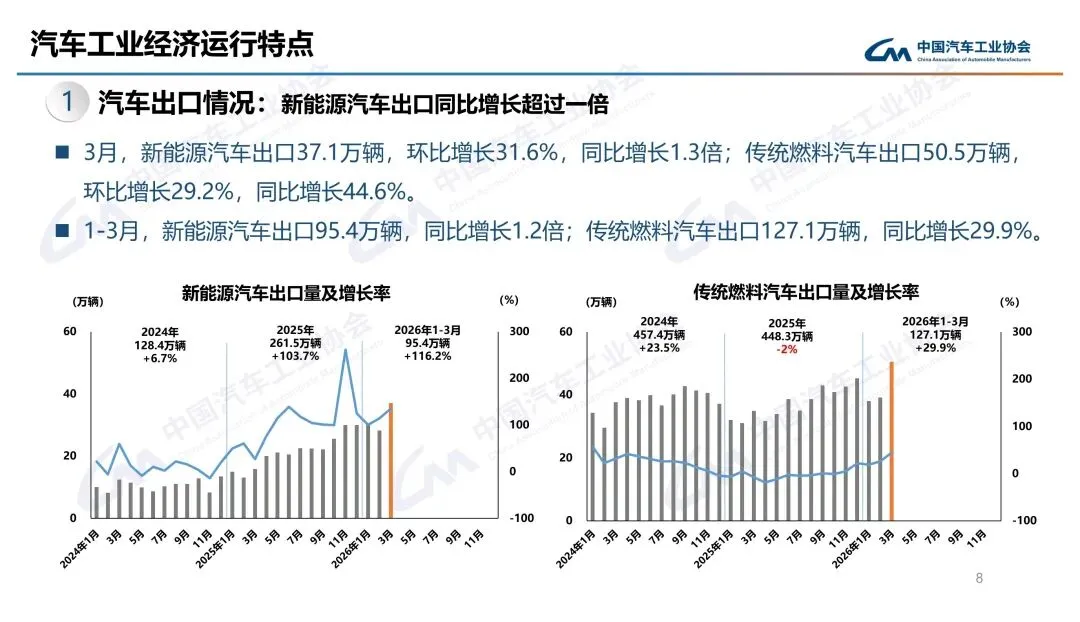 真正亮眼的是出口。3月出口87.5万辆,同比暴增72.7%,一季度累计出口222.6万辆,增56.7%。新能源出口更猛,3月37.1万辆,同比增1.3倍。内销就惨多了,3月国内销量202.4万辆,同比降16%,一季度降20.3%,政策切换和高基数双重压制。