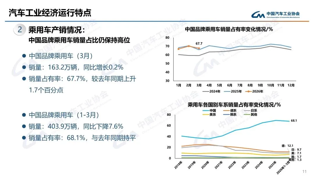 品牌格局上,中国品牌乘用车份额67.7%,同比升1.7个百分点。比亚迪一季度虽跌30%,仍占新能源近四分之一。奇瑞出口排第一。