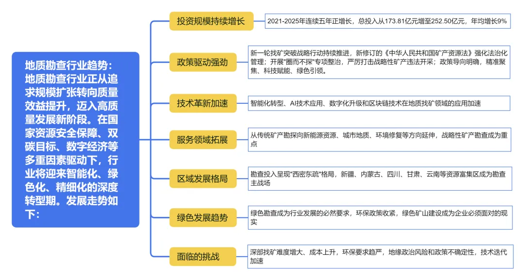 地质勘查行业正从追求规模扩张转向质量效益提升,迈入高质量发展新阶段。在国家资源安全保障、双碳目标、数字经济等多重因素驱动下,行业将迎来智能化、绿色化、精细化的深度转型期。发展走势如下: