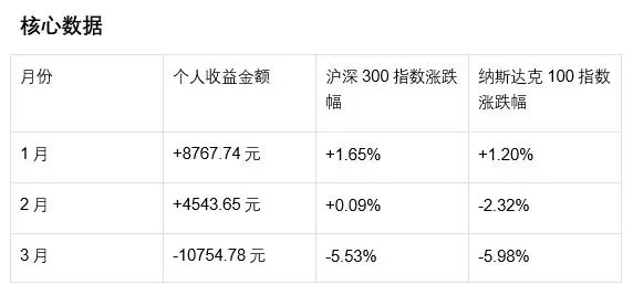 3月收益大幅回撤至-10754.78元,收益率-8.19%,跑输沪深300指数(-5.53%)与纳斯达克100指数(-5.98%),主要受市场整体下跌及持仓结构影响。