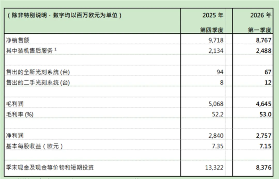ASML今年第一季度净利润从去年同期的近23.6亿欧元增至27.6亿欧元,超出市场预期;毛利润从41.8亿欧元增至近46.5亿欧元,毛利率达53%,同样高于市场普遍预期。该公司预计,本季度销售额将介于84亿欧元至90亿欧元之间,毛利率将维持在51%至52%之间。