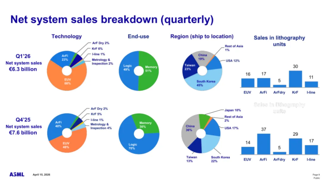 以净系统的出货量来看,2026年一季度EUV系统出货量为16台,环比增加了2台;ArFi系统为37台,环比大幅减少了20台;ArFdry系统出货量为5台,环比持平;KrF系统出货量为30台,环比增加1台;I-line系统出货量为11台,环比减少6台。
