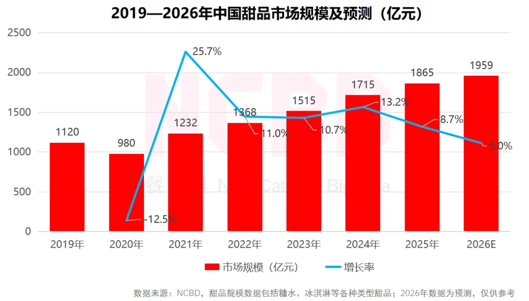 1、NCBD(餐宝典)数据显示,2025年中国甜品市场规模达1865亿元,同比增长8.7%,高于餐饮行业整体增速;预计2026年甜品市场将逼近2000亿元