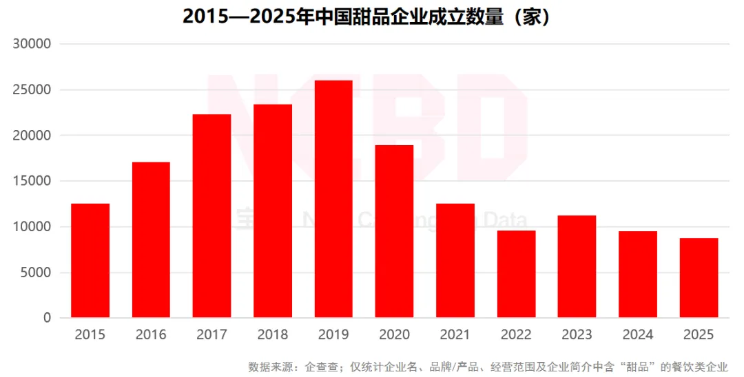 3、2019年,中国甜品相关餐饮企业成立数量高达2.6万家,达历年之最。从2020年开始,甜品企业成立数量出现下滑,2024年降至不足1万家,2025年则继续下降,同比降8.3%。不过,也有部分品牌呈现出强劲的增长态势,整体呈分化状态