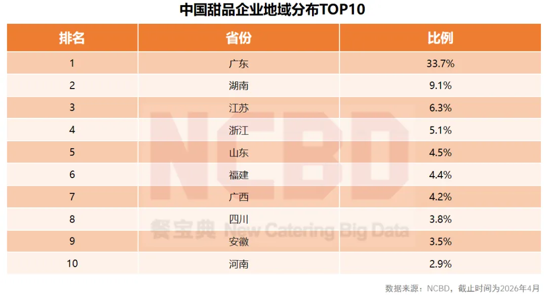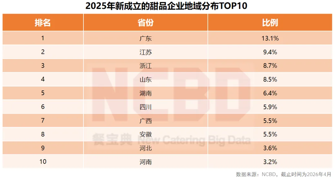 5、2025年,新成立的甜品企业中,广东占了13.1%,江苏占9.4%,浙江占8.7%。从企业的新增数量来看,广东省外的甜品企业正在增多