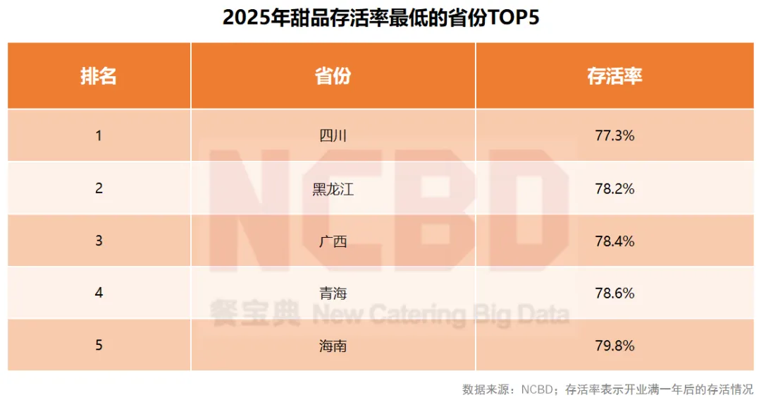 6、NCBD(餐宝典)数据显示,从甜品门店的存活率来看,四川省甜品店的存活率最低(77.3%),其次是黑龙江(78.2%)、广西(78.4%)、青海(78.6%)、海南(79.8%)