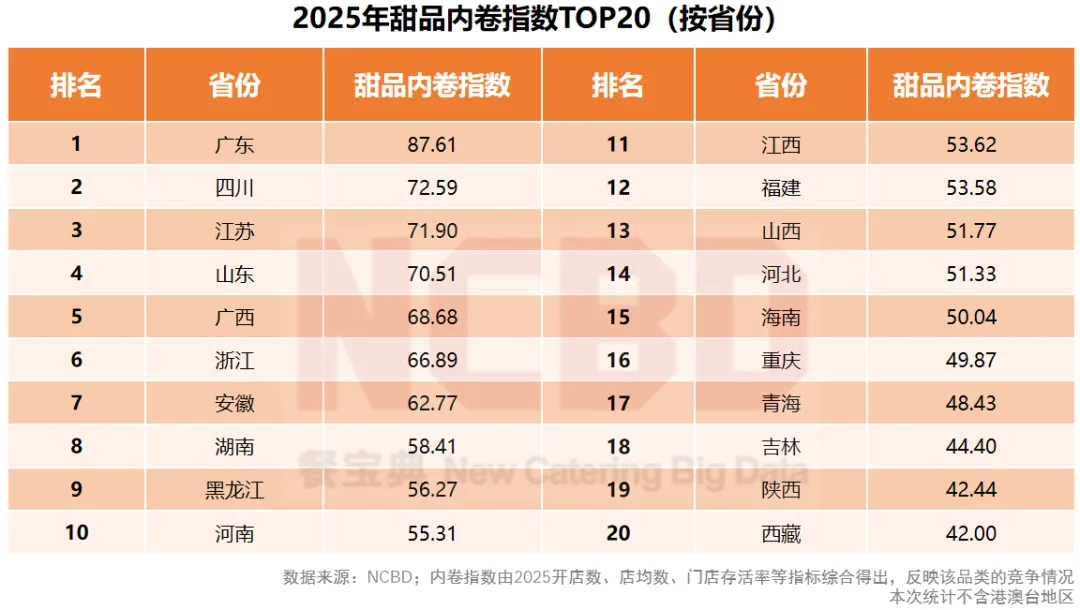 7、从甜品内卷情况来看,广东甜品全国最卷,内卷指数高达87.61;其次是四川(72.59)、江苏(71.9),分列二、三位