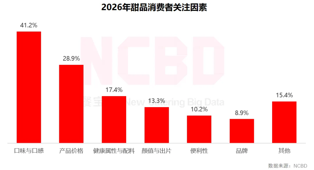 14、在甜品消费者关注的因素中,口味与口感占比最高(41.2%),其次是产品价格(28.9%);17.4%的消费者会关注健康属性与配料