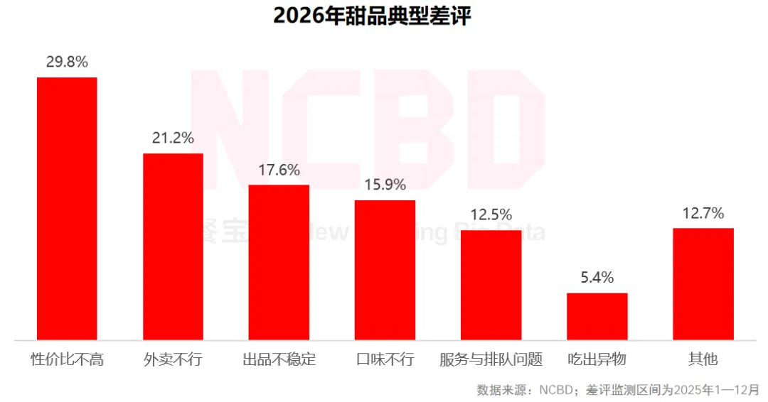17、NCBD(餐宝典)数据显示,在甜品典型差评中,价格方面的差评较多,性价比不高比例接近30%;因为外卖问题引发的差评占比21.2%,有33.5%的与产品有关(口味不行、出品不稳定等)