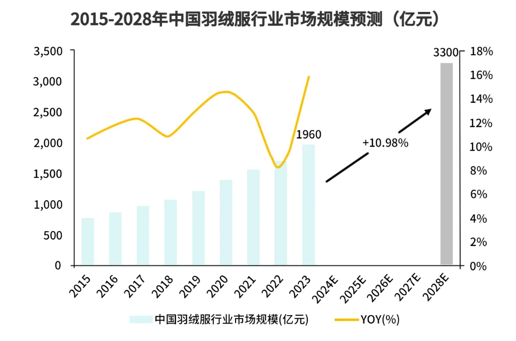 数据见证成长:2023年中国羽绒服市场规模已逼近2000亿元,业界预测,到2028年这一数字将突破3300亿元,年复合增长率有望达到11%,增长潜力持续释放。