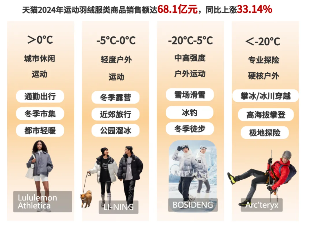 日常通勤、户外运动、出游旅行,成为羽绒服消费的三大核心场景。其中,户外运动场景潜力巨大——2024年天猫运动羽绒服销售额达68.1亿元,同比上涨33.14%,彰显了户外赛道的增长活力。