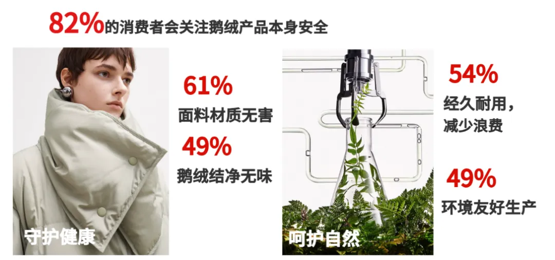 与此同时,健康消费心智不断升级,82% 的消费者重视鹅绒产品安全属性,近八成用户愿意为高科技功能支付溢价。