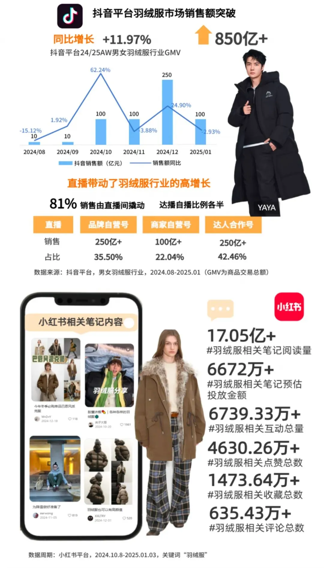 抖音平台羽绒服市场2024年冬突破850亿,保持近12%增速。其中,81%的销售由直播间撬动,达人直播与品牌自播比例各半。小红书平台“羽绒服”相关话题声量也随季节呈爆发式增长。