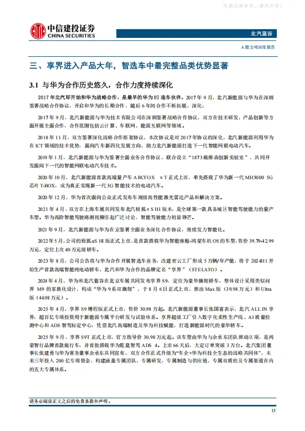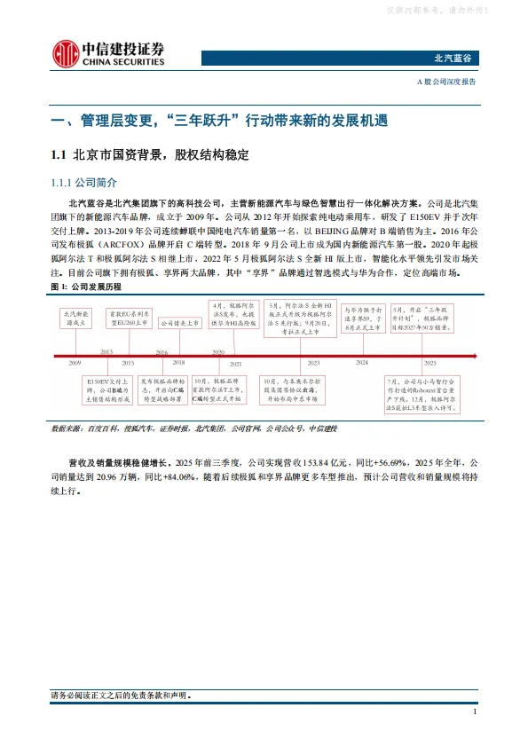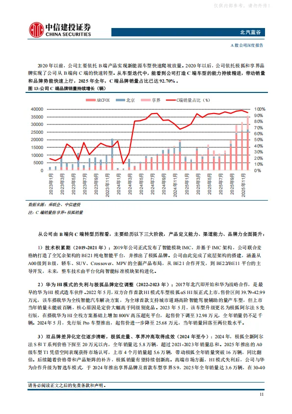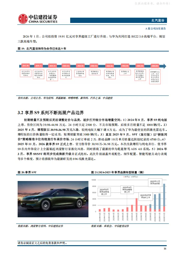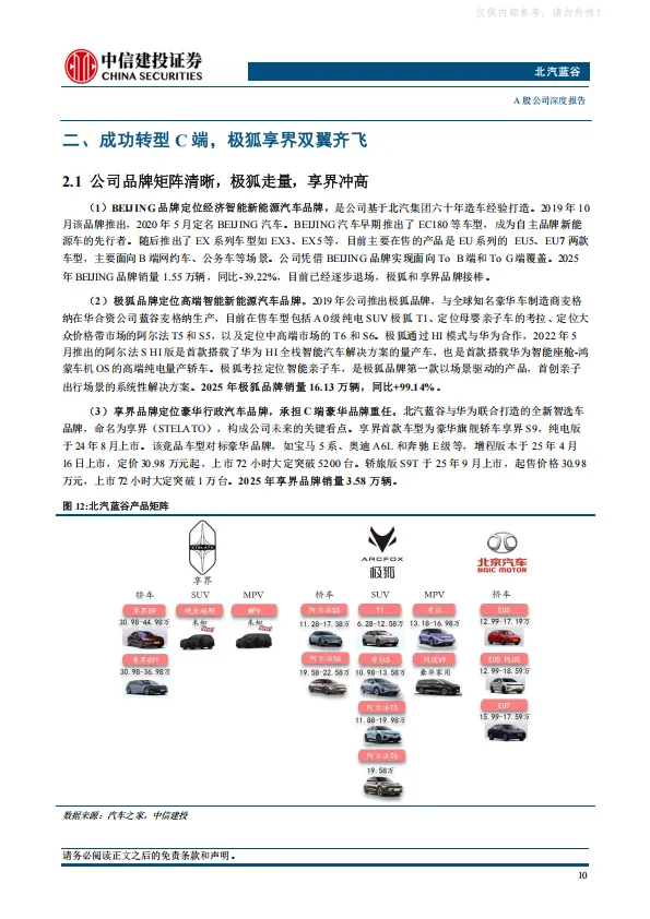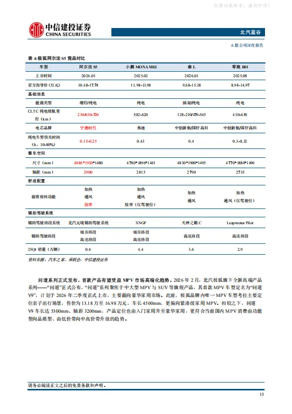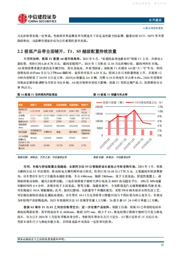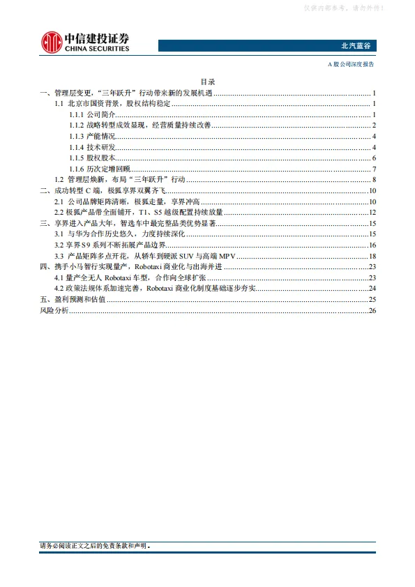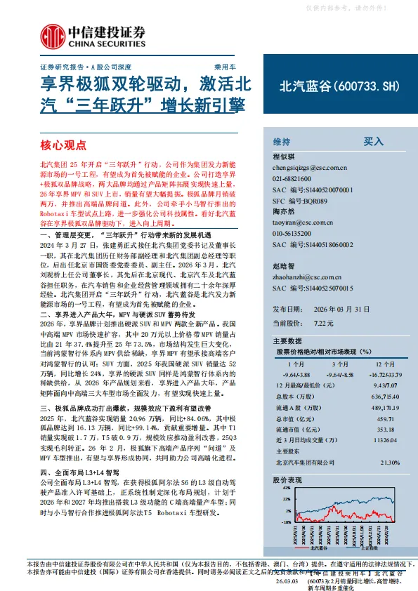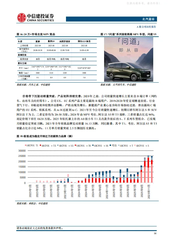 北汽集团2025年开启“三年跃升”行动,公司作为集团发力新能源市场的一号工程,有望成为首先被赋能的企业。公司打造享界+极狐双品牌战略,两大品牌均通过产品矩阵拓展实现快速上量,2026年享界MPV和SUV上市,销量有望大幅提振。极狐品牌月销破两万,并推出高端品牌问道。此外,公司牵手小马智行推出的Robotaxi车型试点上路,进一步强化公司科技属性。