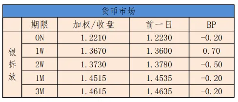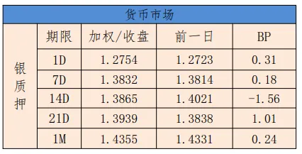 今日银行间市场主要回购利率整体上行。隔夜加权平均利率收盘于1.2754%,上日的收盘价为1.2723%,上行0.31BP;14天收盘价为1.3865%,相比较昨天的收盘价格1.4021%,下行1.56BP。