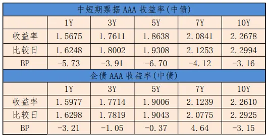中债中短期票据收益率曲线(AAA)1年期收益率下行5.73BP,至1.5675%,3年期收益率下行3.91BP,至1.7611%。