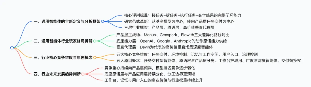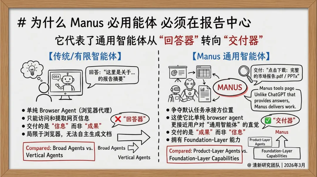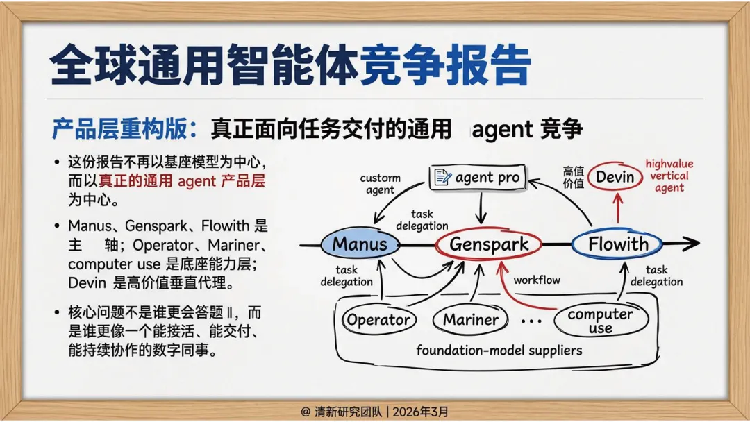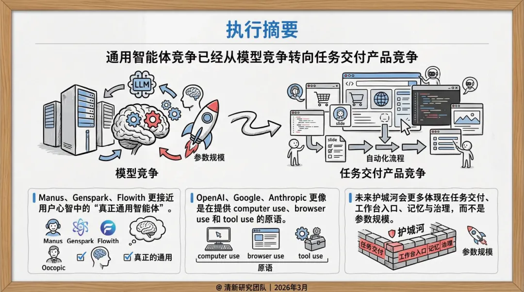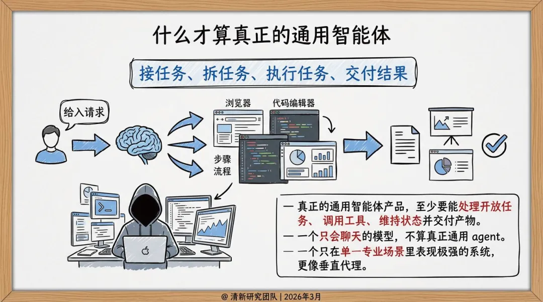 报告指出,通用智能体的行业竞争核心已从基座模型的参数规模竞赛,转向任务交付型产品竞争,评判标准也从模型“答题能力”变为“接活、交付、持续协作的数字同事能力”。这一结论重新定义了行业竞争的核心标尺,帮助从业者跳出参数内卷,聚焦用户真实价值落地。