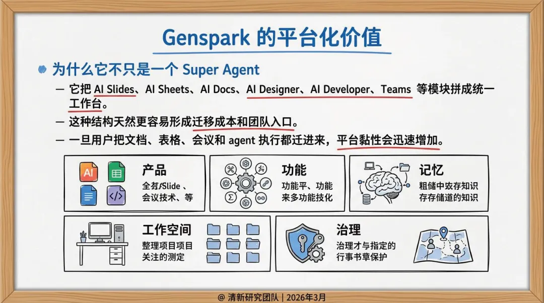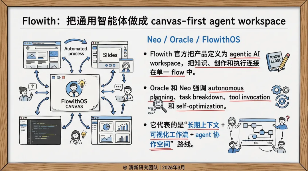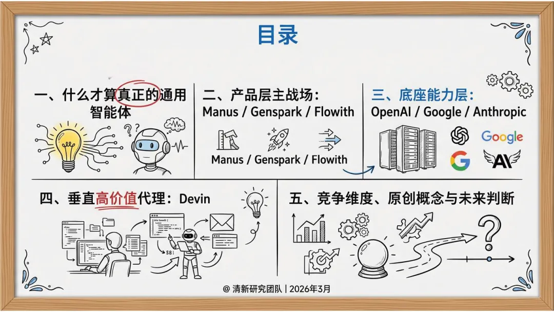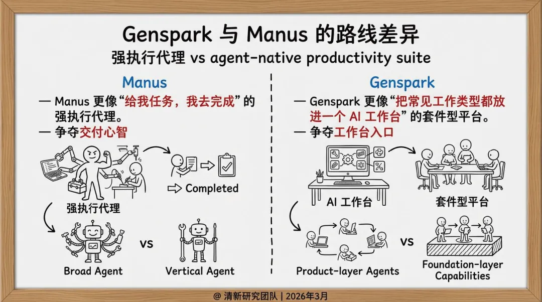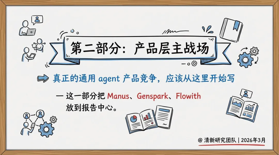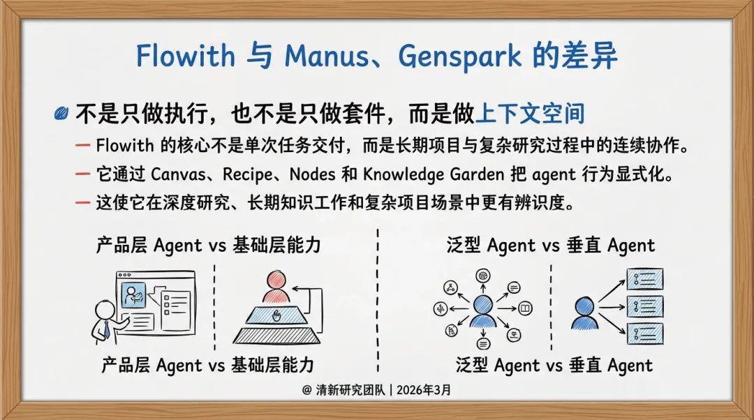 报告认为,Manus、Genspark、Flowith三大产品层玩家,分别走出了强执行代理、套件型工作平台、可视化协作空间三条差异化路线,成为当前通用智能体产品层的核心代表。这一分析清晰呈现了产品层的竞争格局,为行业理解不同产品的核心优势提供了直观参考。