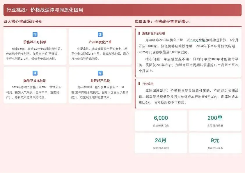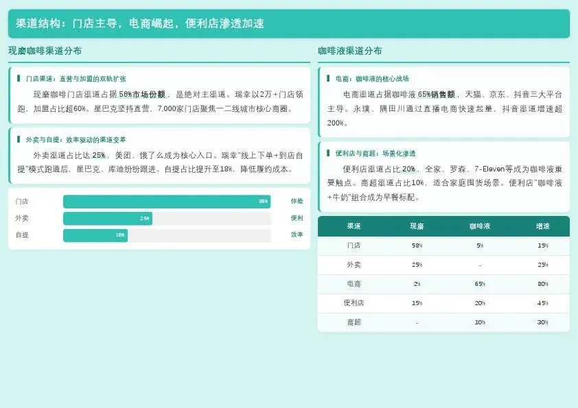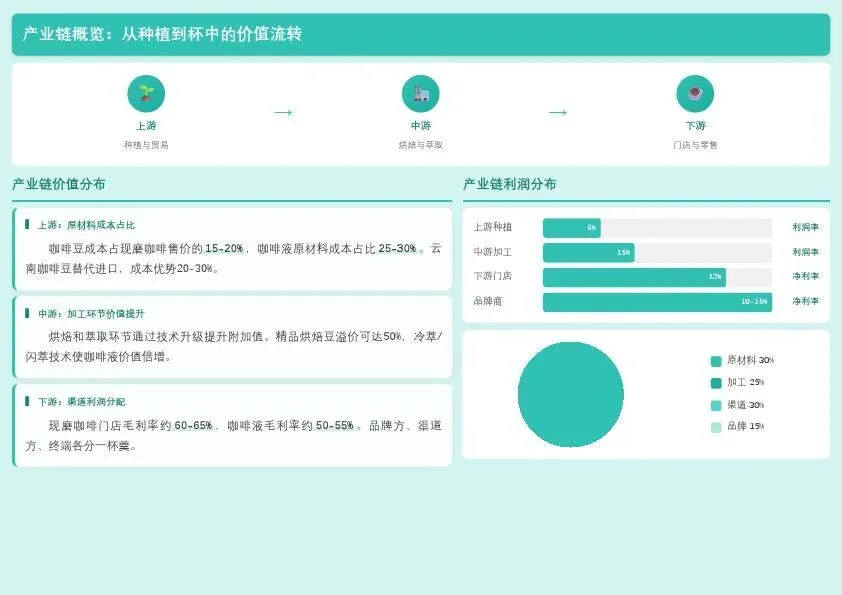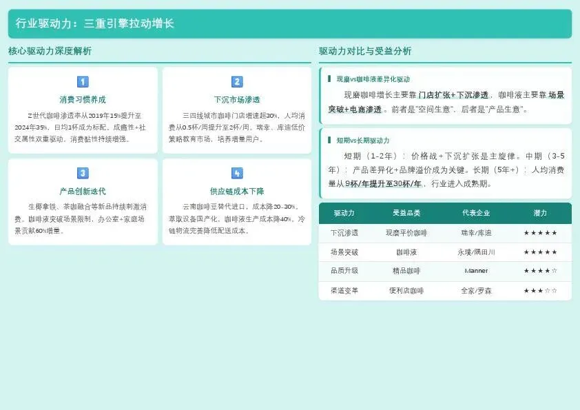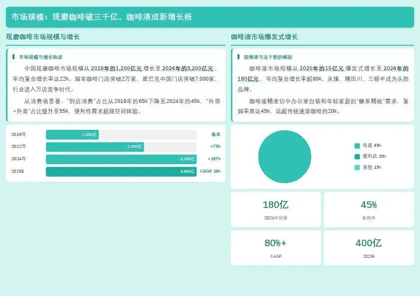 2026年中国现磨咖啡与咖啡液行业研究报告指出,该行业迎来高速发展,现磨咖啡2024年市场规模达3200亿元,2026年预计至4500亿元,咖啡液更是成为新增长极,2024年规模180亿元且年复合增长率超80%,二者渠道呈现差异化特征,现磨咖啡以门店、外卖为主,咖啡液则依托电商渠道崛起,便利店渗透也在加速;消费端从精英走向大众,20-35岁为核心群体,女性占比更高,下沉市场增速显著,消费需求从功能转向悦己,价格敏感度分化,早晨通勤和下午提神为核心消费时段;行业增长由消费习惯养成、产品创新、下沉渗透和供应链成本下降共同驱动,但也面临价格战、咖啡豆成本波动、产品同质化和监管趋严的挑战,库迪的发展困境更是印证了低价竞争的不可持续性。产业链层面,上游云南咖啡豆崛起加速本土化进程,精品率持续提升并获政策支持,中游烘焙和萃取技术不断升级且设备国产化降低成本,下游现磨咖啡门店直营与加盟模式并存,瑞幸凭借加盟扩张和数字化运营领跑,星巴克高端定位承压,咖啡液则在办公室、家庭等场景实现广泛渗透,永璞、隅田川、三顿半成头部品牌。竞争格局上,现磨咖啡呈瑞幸领跑、星巴克守高端、Manner走精品平价的态势,咖啡液市场三足鼎立,各品牌通过差异化定位展开竞争,未来行业价格战将趋缓,产品差异化、下沉市场争夺和供应链整合成趋势,2026-2030年行业将逐步进入成熟期,2030年市场规模有望突破6000亿元,人均消费提升空间大,同时现磨咖啡头部、供应链企业、咖啡液新锐等存在投资机会,也需警惕价格战、原料成本波动等多重风险。以上资料均从网络公开资料收集整理而成,所有报告版权归原公司、机构所有!如有侵权请留言联系我们,我们将第一时间处理。