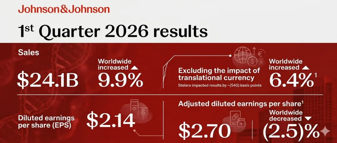 2026年4月14日,强生公司公布了2026年第一季度财务业绩。在全球医疗健康产业面临专利悬崖、价格谈判和地缘政治多重挑战的背景下,强生以一份超预期的成绩单回应了市场的担忧——第一季度销售额241亿美元,同比增长9.9%,超出市场预期的236亿美元。