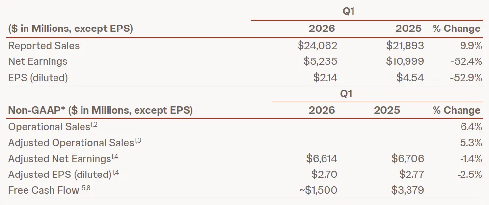 营收241亿美元,超出市场预期的236亿美元。净收益同比下降52.4%,主要受无形资产摊销费用和特殊项目的拖累——这些非现金或一次性项目在收购整合和业务重组期间属于常见现象。调整后每股收益2.70美元,较上年同期的2.77美元微降2.5%,降幅远小于报告净利润的降幅,表明强生的核心经营基本面保持稳健。
