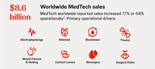 医疗器械板块成为本季度的增长引擎之一,销售额达86.4亿美元,同比增长7.7%。