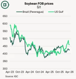尽管巴西2025/26年度大豆出口预期大幅上升,但政府数据显示,从10月到次年3月的半年出口量为3,780万吨,而2024/25年度同期为3,140万吨。美国农业部的估算意味着,巴西4月至9月的大豆出口将超出去年同期550万吨,其中大部分可能集中在接下来的四个月内,这也提振了巴拿马型船需求。