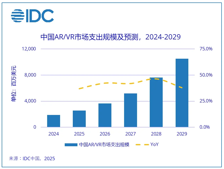 目前全球VR产业正呈现爆发式增长态势,IDC预测,2024年全球增强与虚拟现实(AR/VR)总投资规模达152.2亿美元,并有望在2029年增至397.0亿美元,五年复合增长率(CAGR)将达21.1%。中国将成长为全球AR/VR最重要的市场之一。IDC预测数据显示,2024-2029年中国AR/VR市场将以41.1%的CAGR保持高速增长。