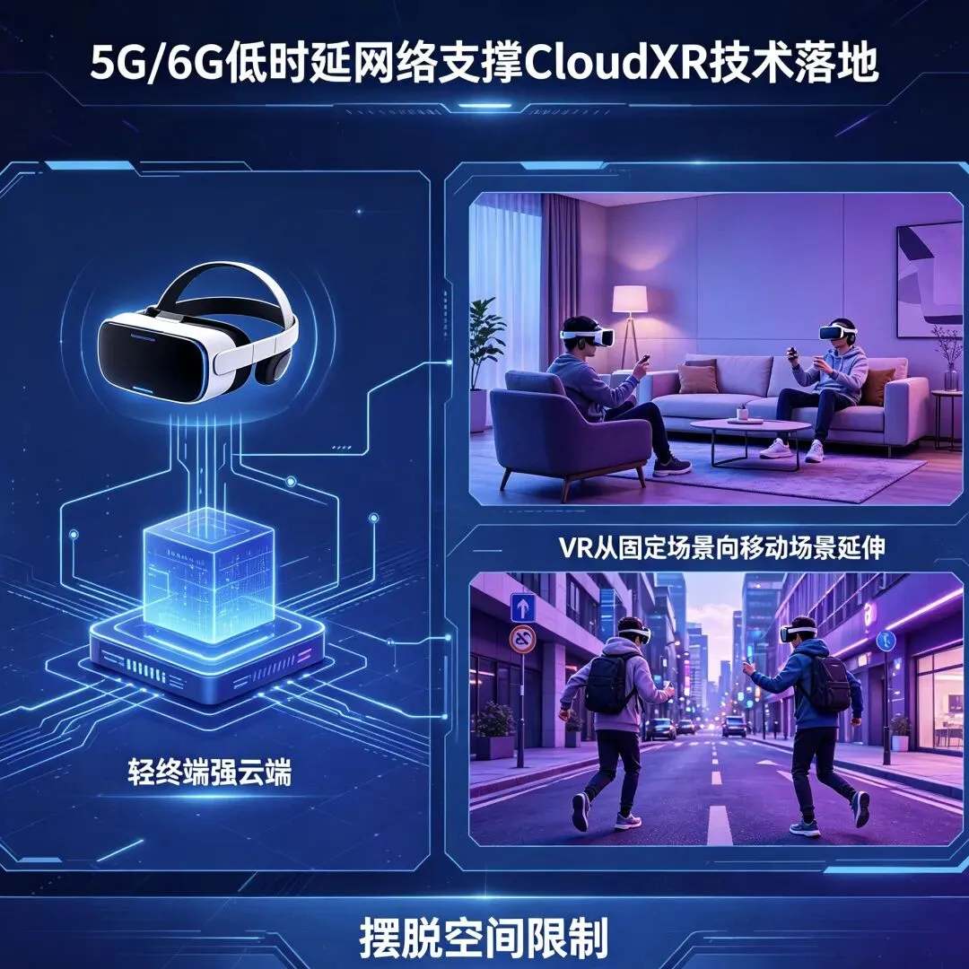 5G/6G低时延网络支撑CloudXR技术落地,实现“轻终端、强云端”,设备更易普及,体验更流畅,推动VR从固定场景向移动场景延伸,让VR体验摆脱空间限制。