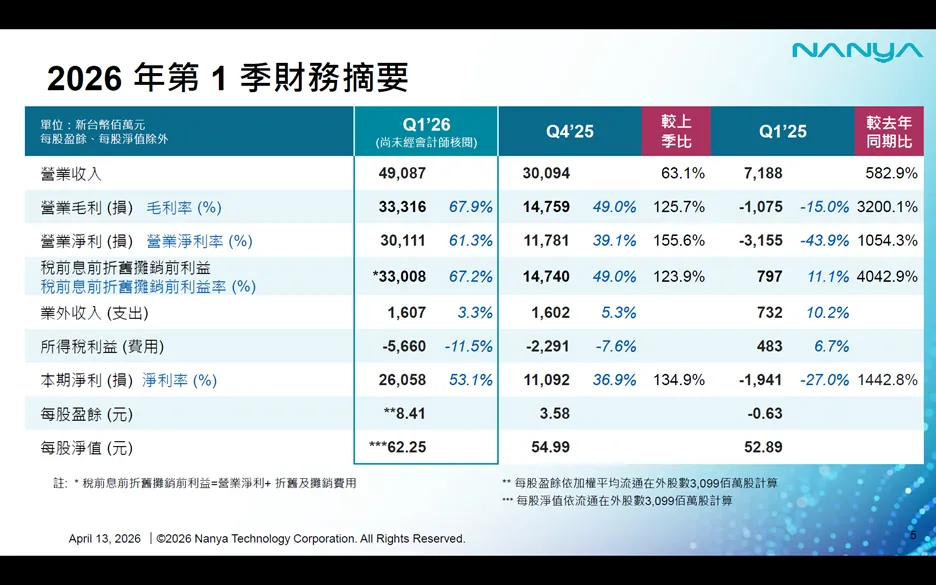 再次列示2026年Q1合并综合损益表核心数据,与第4页财务摘要一致,确认营收、毛利、净利、每股盈余等关键指标。