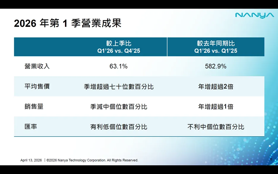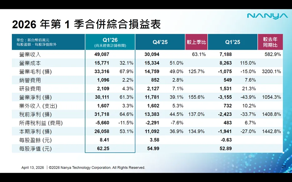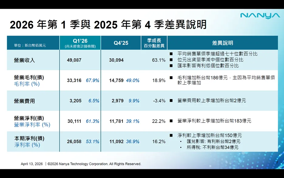 营业收入:季增63.1%,主因平均售价大增,位元出货量季减、汇率小幅有利
