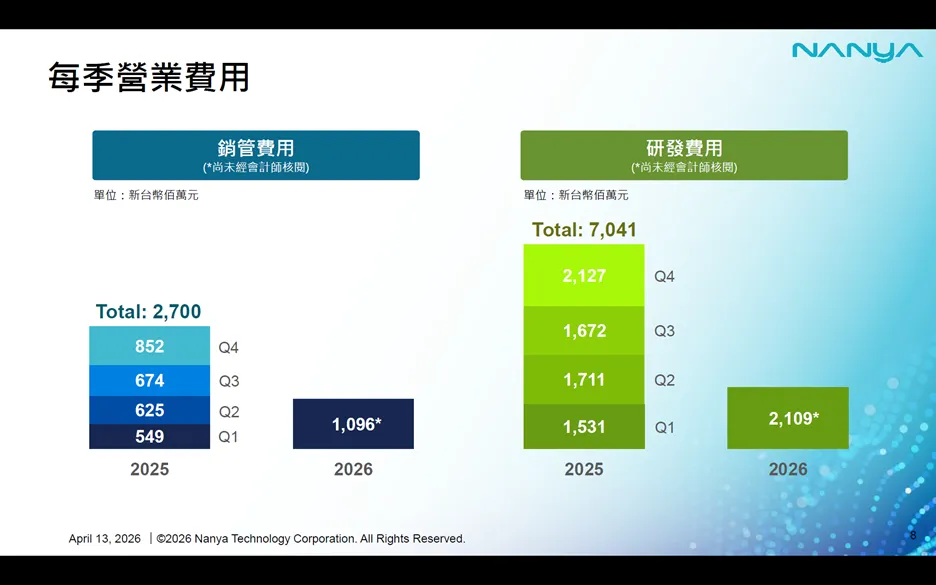 销管费用:2026年Q1为1,096新台币百万元,高于2025年各季度