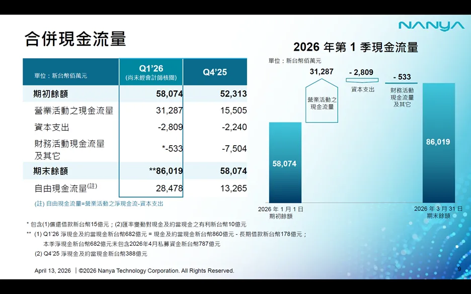 Q1’26净现金及约当现金682亿新台币,未包含4月私募787亿新台币资金