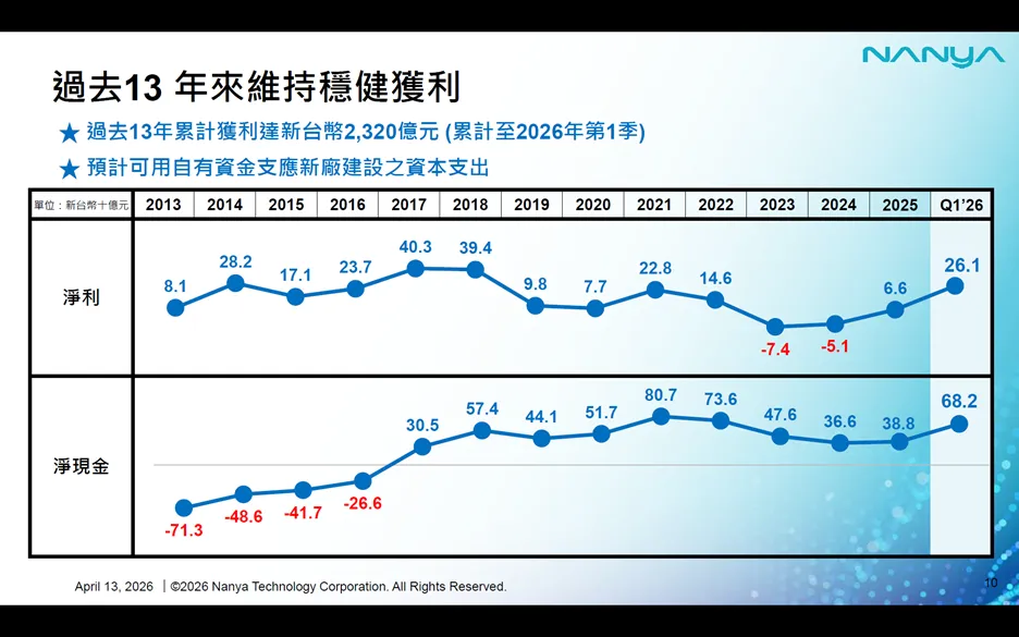 南亚科技过去13年累计获利达新台币2,320亿元(累计至2026年Q1)。