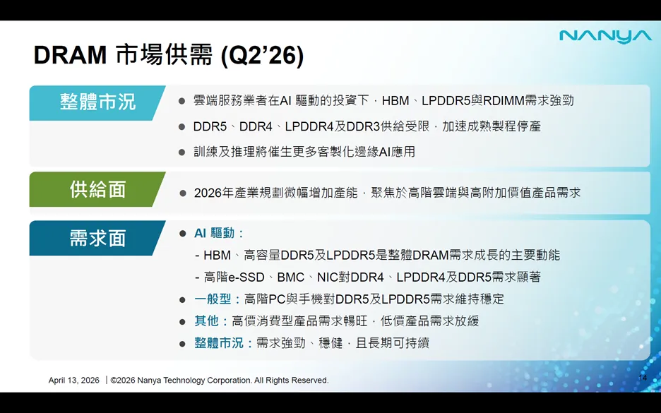 供给面:DDR5/DDR4/LPDDR4/DDR3供给受限,成熟制程加速停产;2026年产业微幅增产能,聚焦高阶云端与高附加值产品